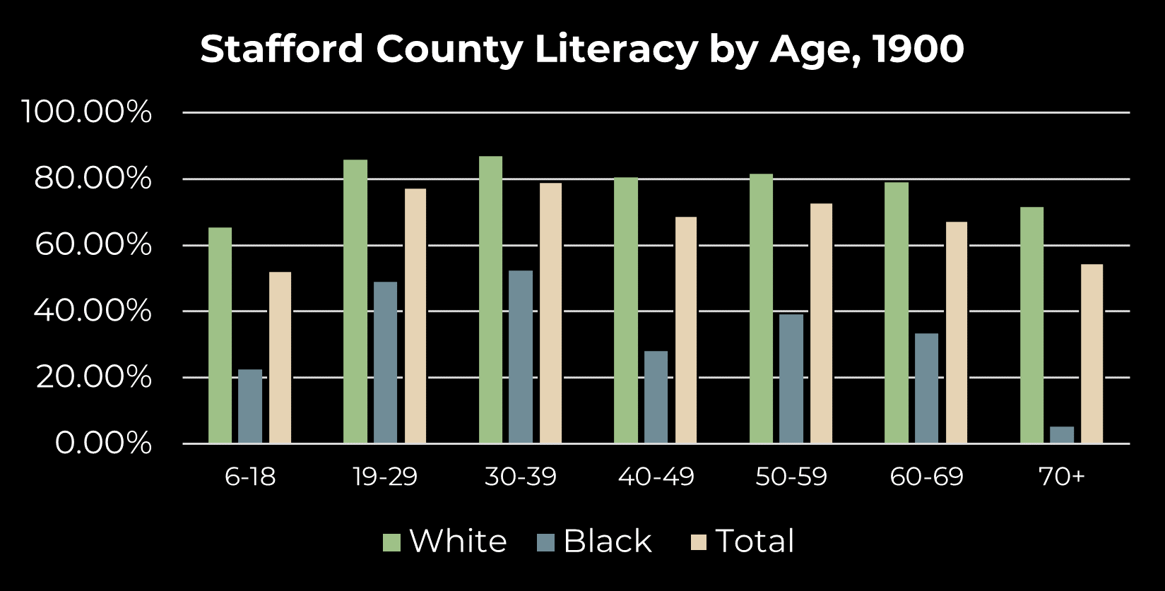 Children near Somerset, c. 1900, collection of Jerrilynn MacGregorRelative to the present, Stafford County’s population in the late 19th century was considerably younger and much less diverse. Only 2 races, white and black, were included in the 1900 Federal Census. The median age of Stafford residents in 1896 was 20, compared to 38 in 2020. The average life expectancy in 1896 was 46.3 years of age, compared to 78.8 today, an increase attributed to improved nutrition, advances in medicine and healthcare, and industrialization. Only 65% of Stafford residents (77% of white residents and 32% of black residents) could read and write by the turn of the century.